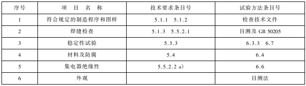 6 1 焊縫檢驗采用目測法 6 2 環(huán)境適應(yīng)性檢測 6 2 1 溫度用 0 ~ 100 ℃溫度計測定。 6 2 2 pH 值測定按 GB / T 6920 進(jìn)行。 6 3 性能試驗 6 3 1 運行速度用秒表和鋼尺測量、計算求得。 6 3 2 可靠性、耐久性試驗 空載試驗不少于 8 h;負(fù)荷試驗不少于 72 h。正常運行平均無故障工作時間和使用壽命根據(jù)用戶 調(diào)查確定。 6 3 3 穩(wěn)定性試驗 出廠檢驗時其傳動部分在制造廠內(nèi)組裝后進(jìn)行,型式檢驗應(yīng)在負(fù)荷試驗或正常運行時進(jìn)行。 a)用鉗形表測量工作電流; b)各部位溫升應(yīng)在開機(jī) 2 h 后用溫度計測量。 c)噪聲測量按 GB / T 3768 進(jìn)行。 6 4 涂裝質(zhì)量檢驗 a)漆膜厚度使用電磁式漆膜測厚儀測量; b)外觀用目測法檢驗; c)漆膜附著力按 GB / T 1720 的規(guī)定進(jìn)行檢驗; d)如表面進(jìn)行熱噴涂應(yīng)按 GB / T 9793 進(jìn)行檢測。 6 5 主梁的撓度測量,應(yīng)在安裝以后進(jìn)行,用鋼絲和直尺測得。 6 6 絕緣電阻采用兆歐表測量。 6 7 過力矩保護(hù)裝置的可靠性用力矩試驗機(jī)測量。 6 8 集電器耐壓試驗,在 2 000 V 試驗電壓的條件下做耐壓試驗 1 min,無擊穿現(xiàn)象。 6 9 中心回轉(zhuǎn)支承中滾道和鋼球硬度根據(jù) JB / T 2300 的檢測方法,用硬度計測量。