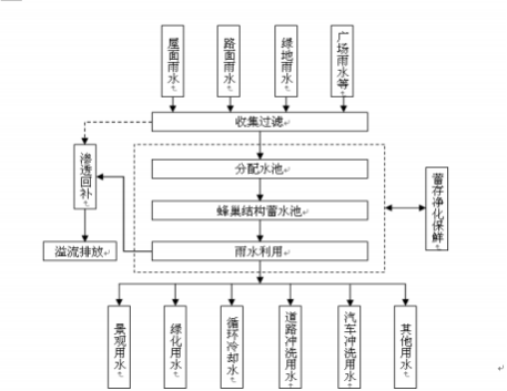 補(bǔ)”、“溢流排放”四個(gè)子系統(tǒng)組成,如下圖所示。雨水分別通過(guò)由砂基透水 磚鋪裝形成的海綿型吸水地面,以及砂基透水路緣石、濾水溝及溝蓋板等構(gòu)成 的“面式排水”結(jié)構(gòu)收集過(guò)濾;過(guò)濾后的雨水由導(dǎo)水管流入分配水池,進(jìn)而流 入蜂巢結(jié)構(gòu)蓄水池,雨水經(jīng)過(guò)蜂巢結(jié)構(gòu)的層層過(guò)濾,得以凈化,可用于景觀、 綠化、道路沖洗等方面;過(guò)量雨水溢流進(jìn)入“滲透回補(bǔ)”子系統(tǒng),每個(gè)滲水井 既起到滯留調(diào)蓄作用,同時(shí)又能起到滲透回補(bǔ)地下水作用;當(dāng)降雨量超過(guò)上述 系統(tǒng)的容量時(shí),超量溢流的雨水則通過(guò)連通到市政管網(wǎng)的已有管道,實(shí)現(xiàn)錯(cuò)峰排放。
