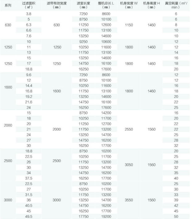 帶式真空壓濾機是以真空負壓為推動力實現固液分離的設備,在結構上,過濾區段沿水平長度方向布置,可以連續完成 過濾、洗滌、吸干、濾布沖洗等作業。帶式真空壓濾機具有自動化程度高、生產能力大、洗滌效果好、分離效果好、濾餅水分低、操作靈活,維修費用 低、節能環保等優點。其自動化程度高,可實現連續生產,提高了過濾效率;生產能力大,可滿足大規模生產的需求;分離效果好,能夠有效地將固體顆粒與液體分離;同時,由于其采用負壓原理工作,能耗較低,對環境無污染。